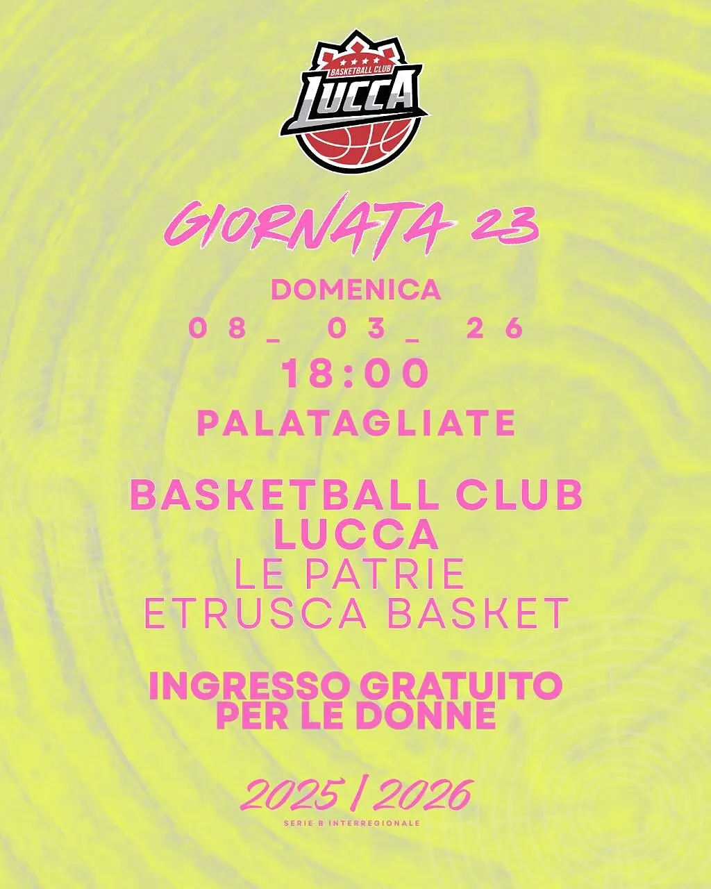 L’8 marzo oltre che la 23° giornata di campionato è anche la festa delle donne e per omaggiarle nel migliore dei modi, il BCL ha pensato di riservare loro, l’ingresso gratuito al Palasport per la partita BCL - Le Patrie Etrusca Basket, durante l’intervallo poi ci sarà ancora un omaggio al femminile, facendo salire sul parquet la squadra delle Mura Spring, attualmente seconde in classifica e lanciate alla conquista della serie A2 femminile.