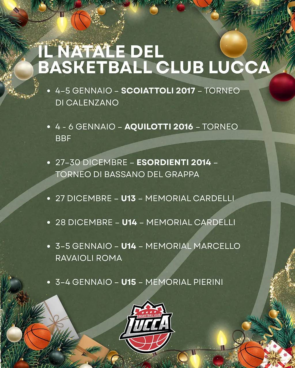 Si cresce di età e ad essere impegnati in un grande torneo saranno gli esordienti, giocheranno il 28, 29 e 30 Dicembre a Bassano del Grappa e anche qui saranno molte le squadre che parteciperanno, suddivise in 8 gironi, ognuno composto da 4 squadre. Il BCL si presenterà a Bassano del Grappa con un nutrito gruppo di ragazzini, tra i quali ci sarà anche uno proveniente dalla società di basket di Massa e Cozzile con la quale il BCL ha stretto un rapporto di collaborazione da inizio anno.